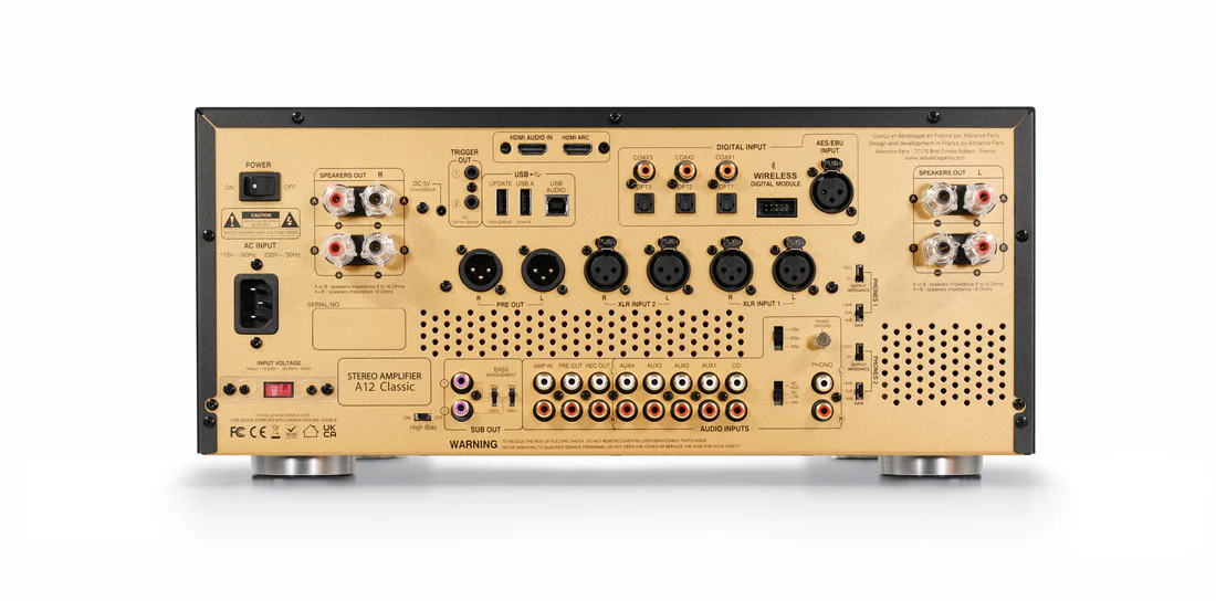 In Advance Paris’s great tradition of designing products with numerous connections, the A12 Classic is no exception to the rule… From HDMI to Phono (MM/MC), analog RCA to balanced XLR, Multiple digital inputs: optical, coaxial and USB, dual subwoofer outputs, 2 speaker zones, Bluetooth (optional with X-FTB01 / X-FTB02).