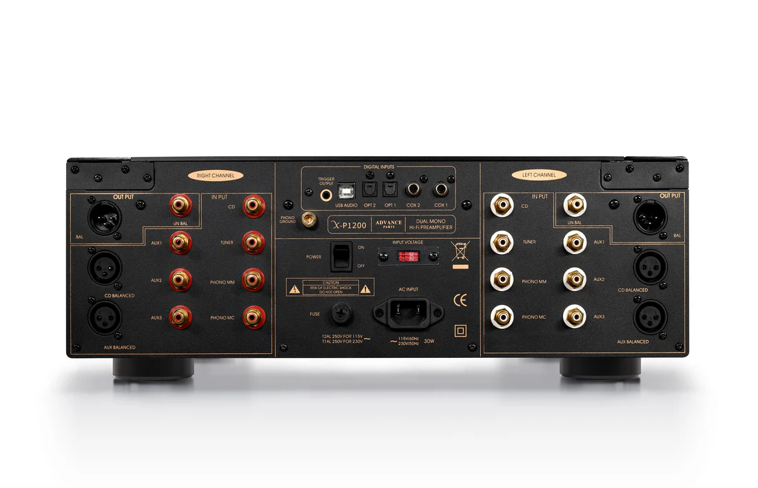 The X-P1200 is equipped with 9 analog inputs including 2 Balanced XLR inputs., A USB B input (XMOS), 2 coaxial digital inputs and 2 digital inputs. On the output side, you will have the choice between a balanced XLR type output  or unbalanced RCA type. Everything has been thought out to make this preamp the benchmark for  the best audio systems: mains input with choke filtering and capacitors, two toroidal transformers with high current capacity, filtering composed of 4 capacitors 12000uF / 150V.