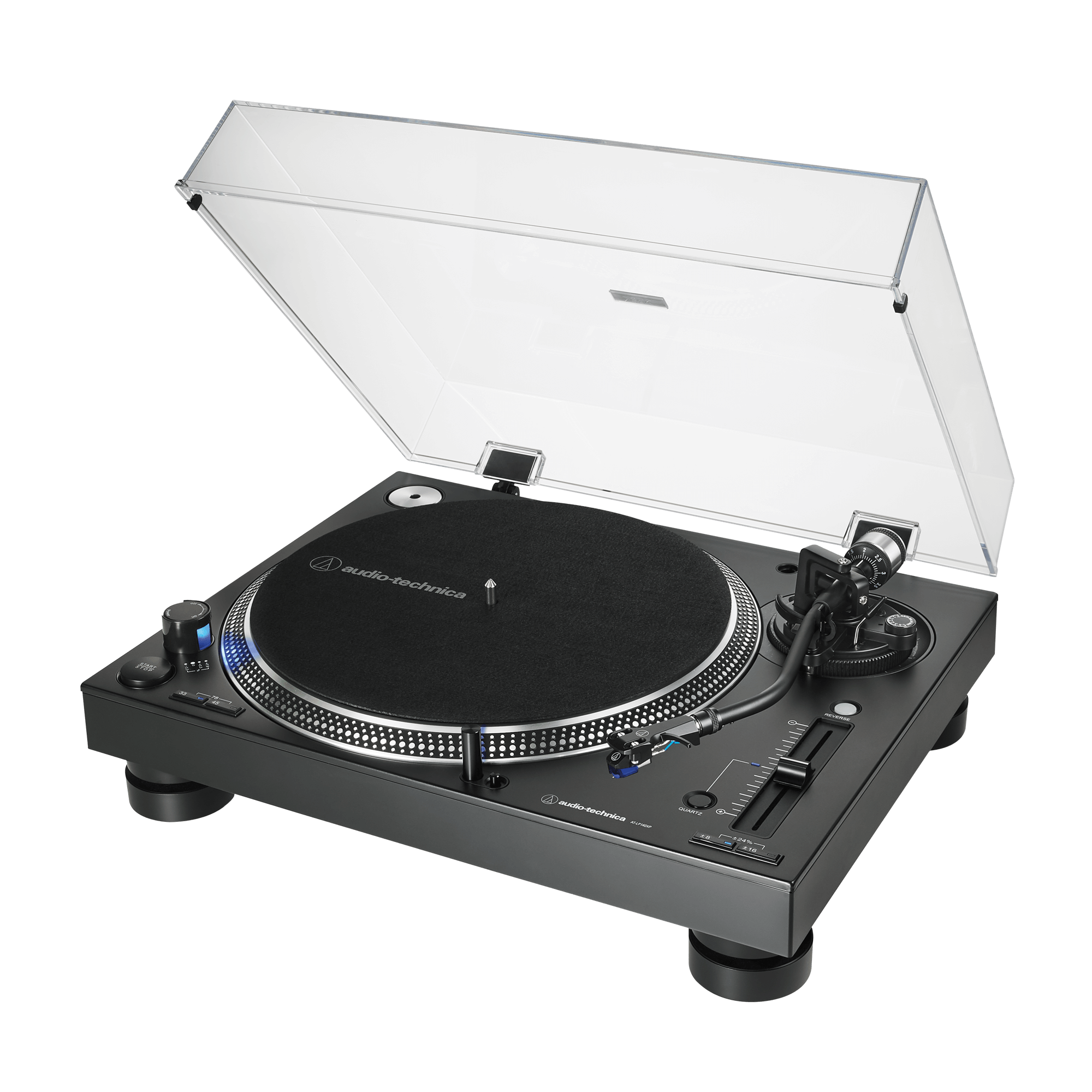 The AT-LP140XP fully manual professional DJ turntable features a high-torque direct-drive motor and anti-resonant, mass-damped, die-cast aluminum platter to ensure stable, on-axis rotation at 33-1/3, 45, and 78 RPM. It is equipped with an S-shaped tonearm with height adjustment, adjustable tracking force (counterweight) and adjustable dynamic anti-skate control.