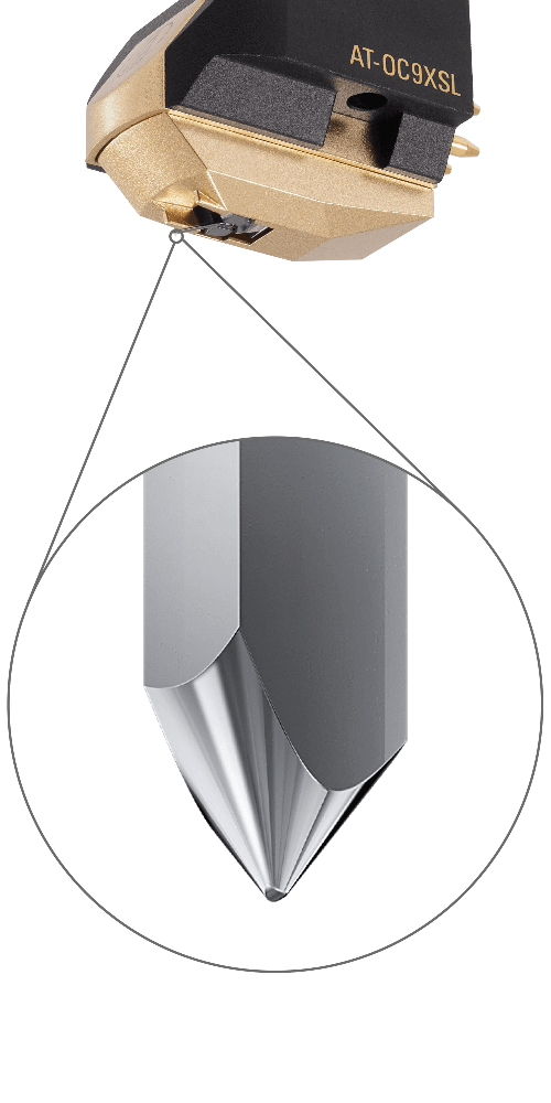 The AT-OC9XSL Dual Moving Coil cartridge with special line contact stylus is designed to provide outstanding channel separation. The Pure Copper by Ohno Continuous Casting (PCOCC) coils ensure pure audio transmission and are aligned in a reverse V-shaped formation to exert less pressure on the stylus, thereby minimizing distortion