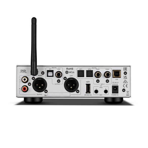 | Design Philosophy and Core Technology | ES9038Q2M 32-bit DAC MQA Full decoder (PC USB, Coax / Optical) OLED Display Bluetooth 5.1 (aptX / aptX HD) streaming Dedicated Current-Feedback Headphone Amp Supports playing USB memory device (MP3 / WMA / APE / AAC / WAV / FLAC) USB Firmware Upgrade |